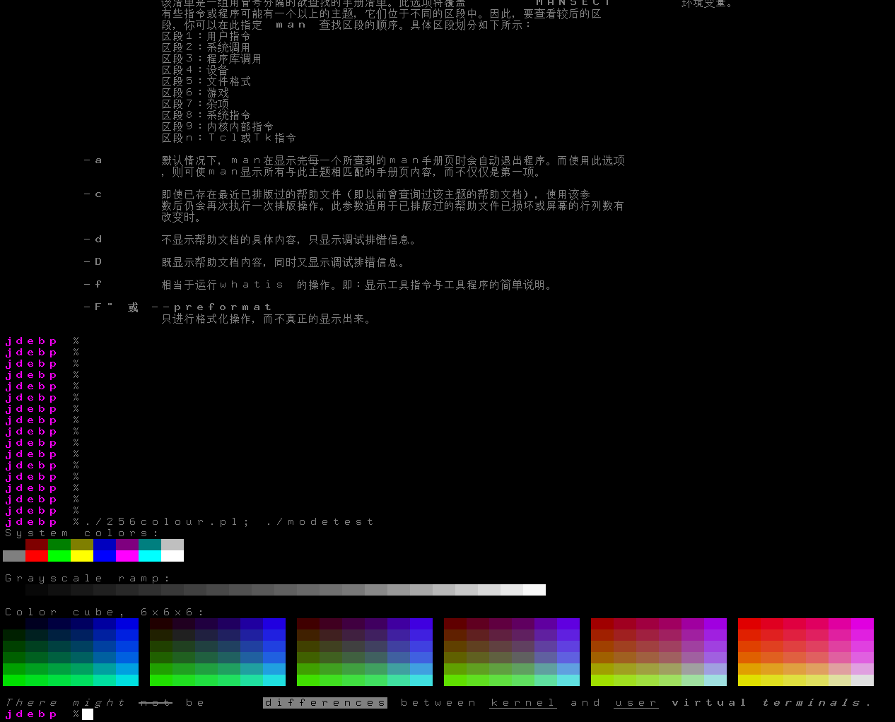 The colour blocks indicate support for ISO 8613-6:1994/ITU T.416:1993 Set Graphic Rendition control sequences. Shown here are the effects of the SGR control sequences that select from the (conventional) 256-colour palette, the result of a fairly widely known Perl script. Not shown here, but also supported, is full 24-bit RGB SGR colour support.