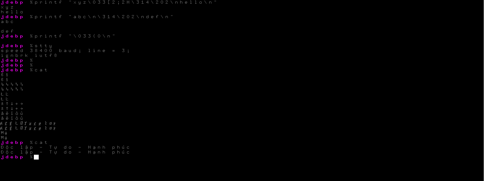 Inspired by the mosh blurb the second screen illustrates how nosh user-space terminal emulators employ UTF-8 as standard and do not suffer from ISO 2022 problems.